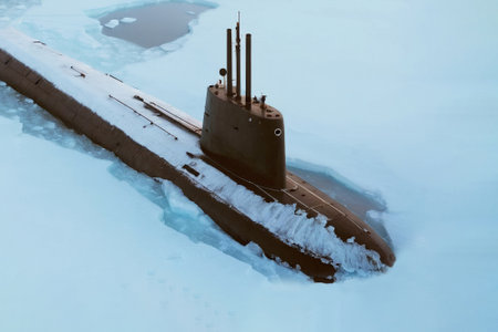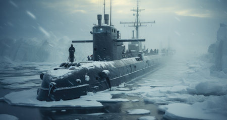 Submarine Navigating Icy Waters Near Arctic Region During Foggy Conditions While Crew Members Prepare for Exploration. Generative AI