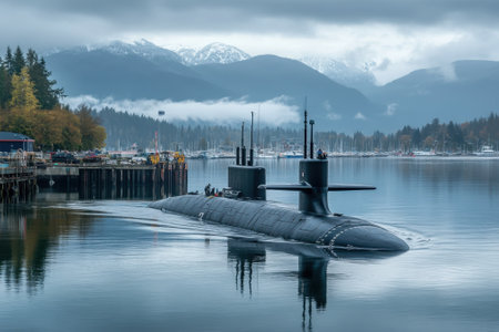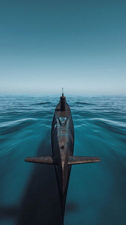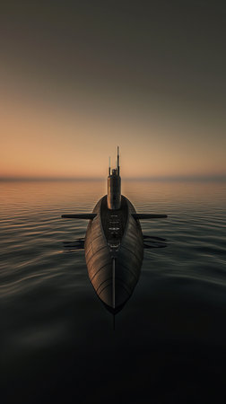 Portrait of maritime A nuclear submarine awaits in calm waters, vertical format for deep exploration themes
