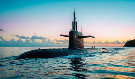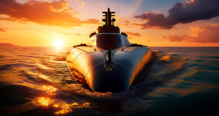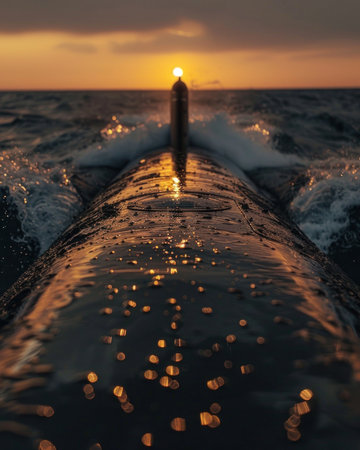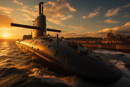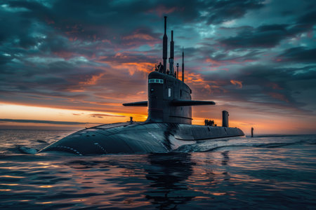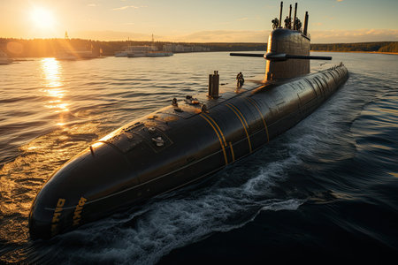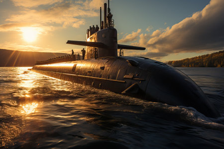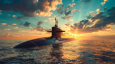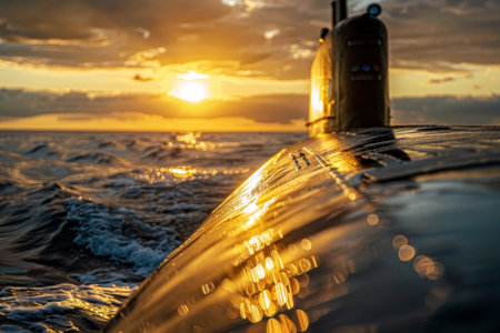 As the sun dips below the horizon, casting a golden glow across the waves, a state-of-the-art naval submarine surfaces, its powerful form cutting through the water. This image captures a moment of quiet strength and readiness, symbolizing advanced military technology, maritime security, and the silent vigilance of underwater defense forces on a critical mission.