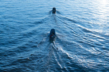Combat military nuclear diesel electric submarine on background of blue ocean water. Top view aerial drone