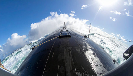 From a dramatic first-person perspective on the bow, a naval submarine emerges from the depths, parting the ocean waves under a bright, sunny sky. This image captures a moment of immense power, advanced technology, and strategic military presence on the high seas.