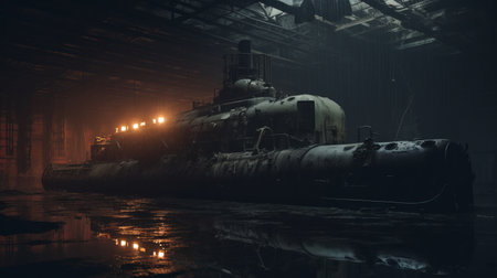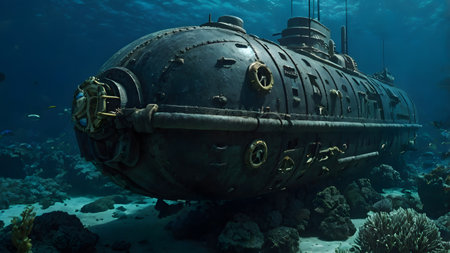 a metal submarine, abandoned underwater, captured in the style of vray tracing. this industrial horror photograph by marcin sobas showcases a brooding mood with mysterious backdrops. the image exudes an eerie atmosphere, blending urban industrialism with the captivating details of an 8k resolution. ai generated
