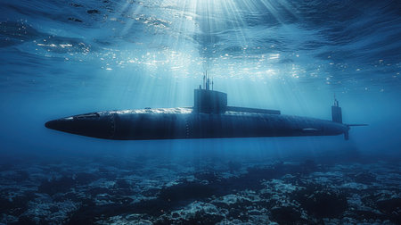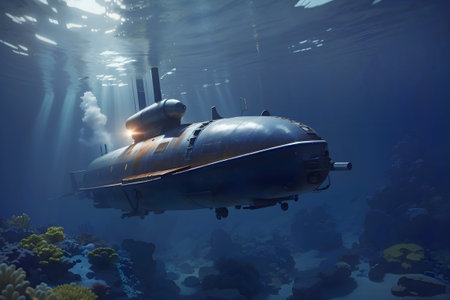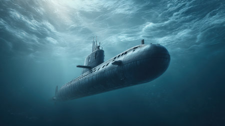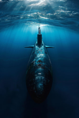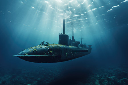 A captivating view of a submarine navigating through the deep ocean, enhanced by sunlight breaking through the surface, offering a sense of adventure and exploration.