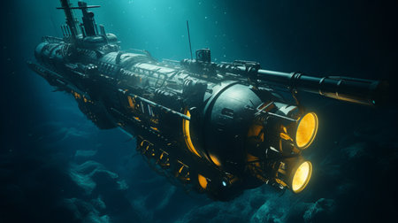 A submarine glides through the dark ocean waters, illuminated by a bright light. Bubbles trail behind as it navigates the deep sea environment, showcasing advanced technology.