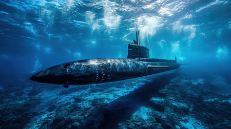 Wide panoramic of a nuclear submarine beneath the sea surface, merging technology with the marine environment, copy space aside