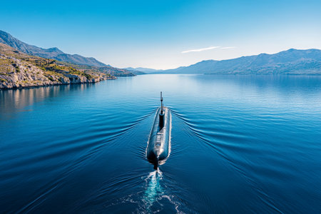 Modern submarine navigating the ocean with mountainous horizon and clear blue sky above