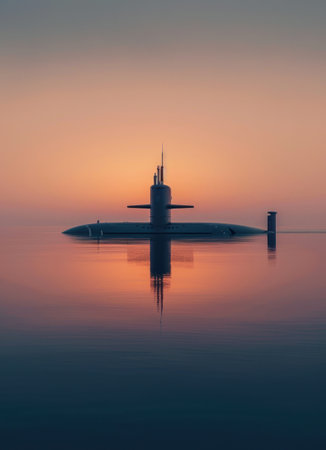 As the sun sets, a submarine floats gracefully on the calm water, creating a beautiful contrast against the colorful sky and peaceful natural landscape