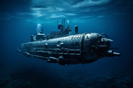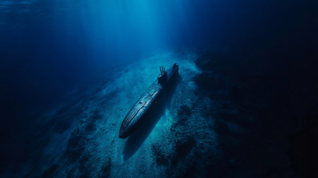 A moving shot of a submarine diving deep beneath the surface created with Generative AI