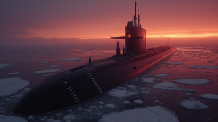 Submarine Navigates Icy Waters of a Remote Arctic Landscape During Twilight Exploring Uncharted Territories and Showcasing Extreme Conditions and Resilience. Generative AI
