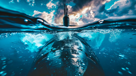 A submarine ascends through the deep blue ocean, breaking the surface and revealing a breathtaking view of the sky and clouds.