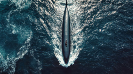 A sleek submarine glides smoothly across the vibrant blue ocean surface, leaving a trail of foam in its wake, showingcasing engineering marvel.