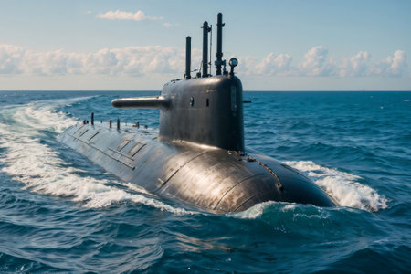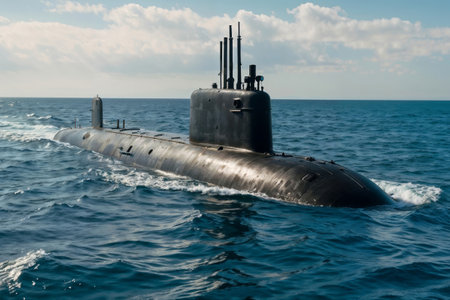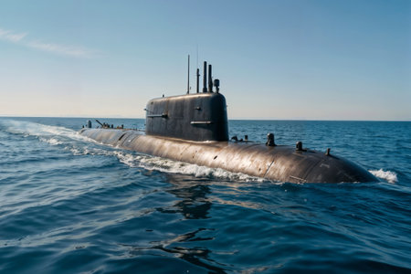 A large submarine is floating in the ocean. The water is blue and the sky is clear. The submarine is the main focus of the image, and it is in motion with Generative AI