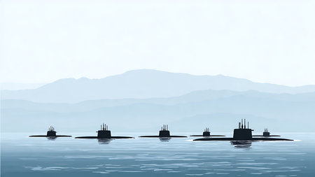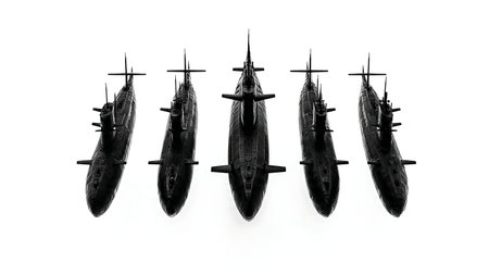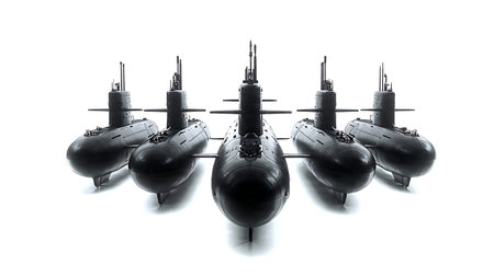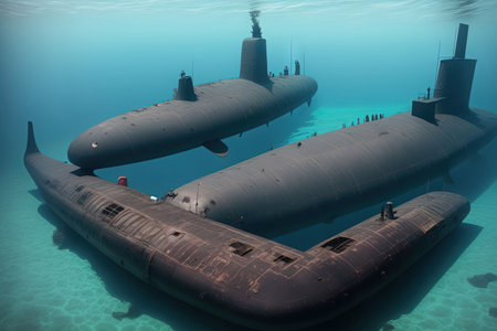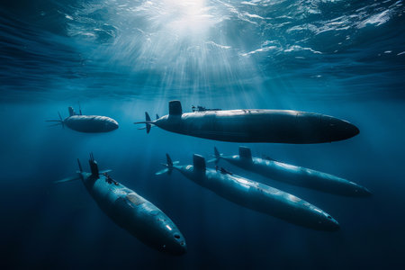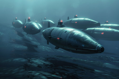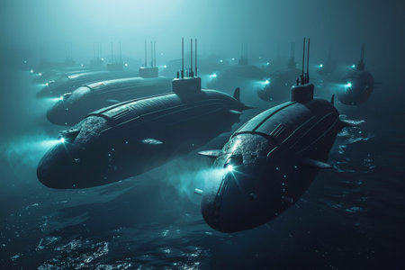 A collection of submarines is seen in the ocean, highlighting their formidable presence beneath the water's surface, A fleet of autonomous submarines patrolling the ocean depths, Ai generated