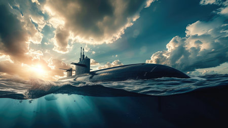Scenery of heavy nuclear submarine floating in vast ocean at sunset sky. Sub in rough water, military control of sea. Protection of water state borders. Naval forces army concept. Copy ad text space