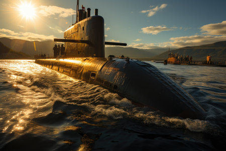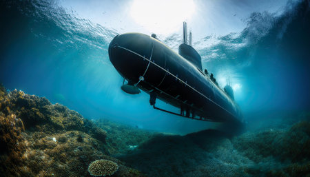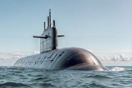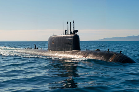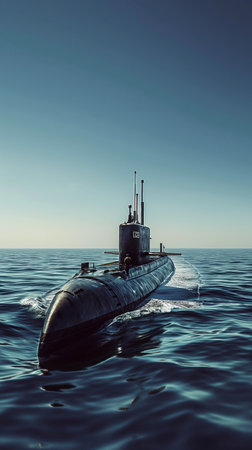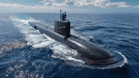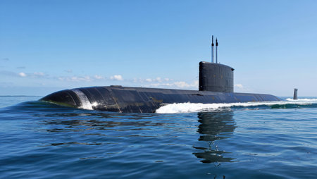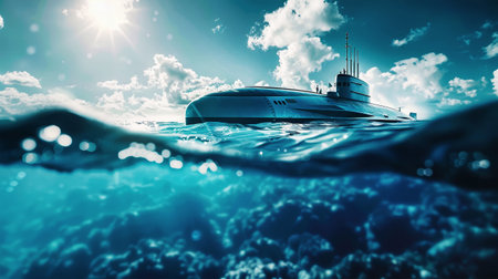 A cutting-edge submarine glides through clear blue waters under a sunny sky. With its sleek design and powerful presence, it showcases advanced naval technology during its operation