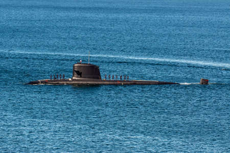 A submarine surfaced above the water. Concept - a submarine sets sail. Scuba diving ship. The concept is war at sea. The navy. Weapons Military ships. Concept - Submarine Service