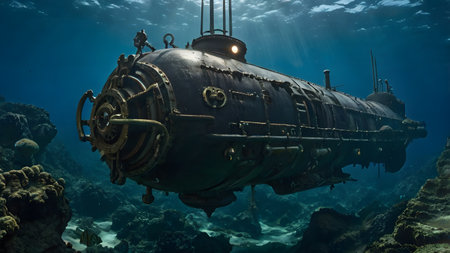 old steel submarine drives in deep sea