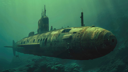 Wide panoramic of a nuclear submarine beneath the sea surface, merging technology with the marine environment, copy space aside