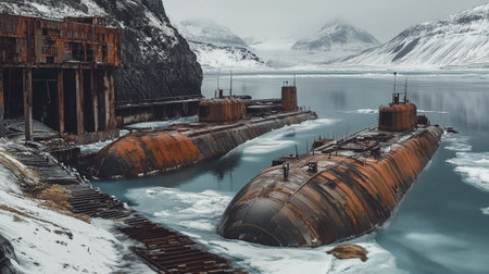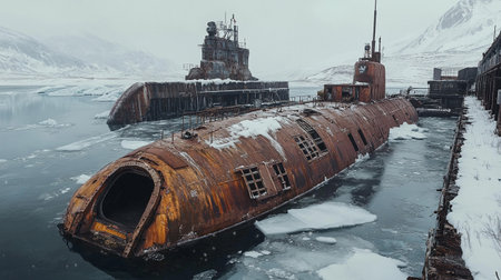 Abandoned rusty submarine in the harbor of Svalbard, Norway