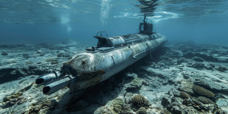 Submarine sunken in the sea. Underwater world