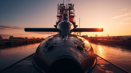 a large submarine is seen in the water, showcasing the darktable processing style. the image captures richly colored skies and highlights the metalworking mastery of the submarine. the soft-focus technique adds a touch of elegance, while foreshortening techniques enhance the sense of depth. with an iso of 200, the symmetrical composition creates a visually captivating scene. ai generated