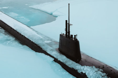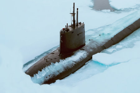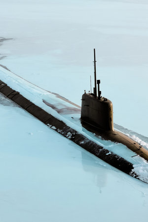nuclear submarine in the arctic ocean, realistic illustration