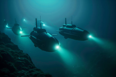 Multiple submarines are deployed in the ocean, emphasizing their role in naval operations and underwater exploration., A fleet of autonomous submarines patrolling the ocean depths, Ai generated