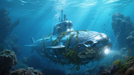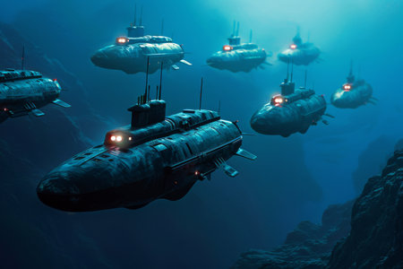 A fleet of submarines navigates through the deep blue ocean, showcasing their sleek designs and military prowess, A fleet of autonomous submarines patrolling the ocean depths, Ai generated