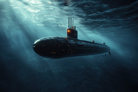 A submarine submerged in dark blue water with rays of light piercing the surface. Concept of military, espionage, underwater exploration, and deep sea adventure.
