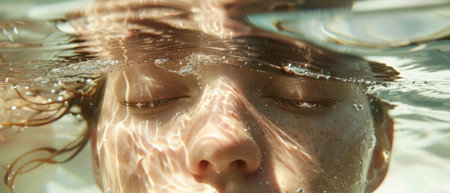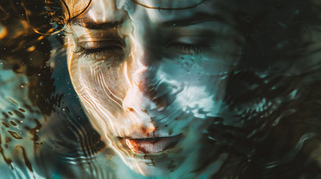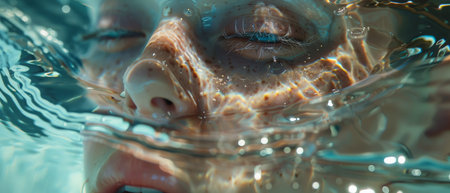 A mesmerizing underwater shot revealing a face surrounded by liquid, creating an ethereal atmosphere. The interplay of light and water enhances the emotional depth.