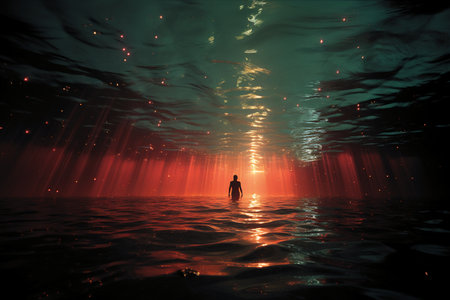 A man stands in the center of a deep blue body of water, A menacing silhouette lurking in deep blue waters