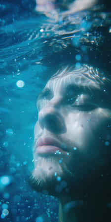Young caucasian man submerged underwater with serene expression, surrounded by shimmering light and bubbles.