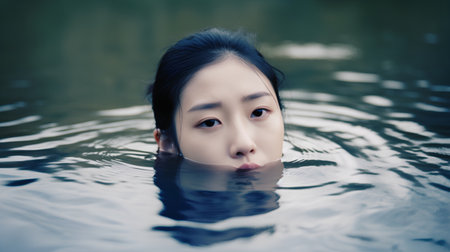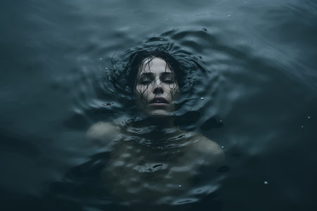 An AI-generated illustration of a young woman submerged in a tranquil body of water