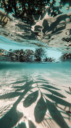 Beneath the clear, shimmering waters of the tropical beach the silhouettes of tropical leaves cast graceful shadows