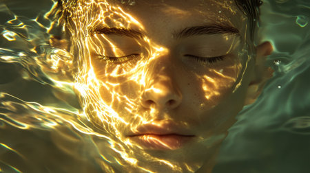 Swimmer's face appears serene beneath the water, with sunlight creating a magical display of reflections and patterns. The tranquil atmosphere enhances the mystical quality of the moment.