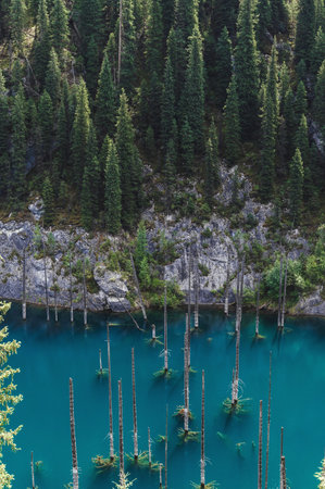 Bog spruce wood in mountain lake. Kaindi lake in Kolsay Kolderi gorge, nature of Qazaqstan National Park, vertical.