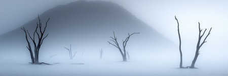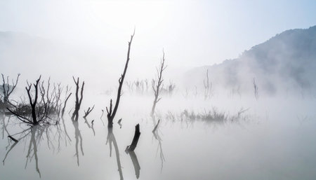 Bare, skeletal trees emerge from the still, pale waters of a mysterious lake, their reflections blurred by a thick, rolling fog. This haunting and desolate landscape evokes a sense of quiet solitude and otherworldly beauty, a silent testament to natures powerful cycles.