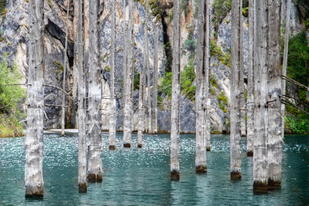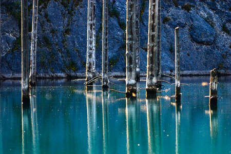 Bog wood in mountain lake. Kaindy lake in Kolsai Koldery gorge, nature of Kazakhstan National Park.