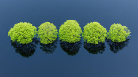 Five spring trees with bright green leaves are standing in calm water with their reflections visible, creating a minimalist and serene landscape. Generative ai