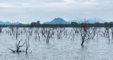 Atmospheric landscape with flooded bare trees in a lake against the backdrop of mountains in the jungle of Sri Lanka