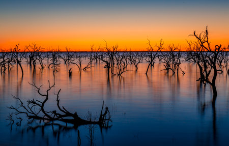 Rich vibrant colours of Australian sunrises, in outback Australia.... trees in lake and their reflections