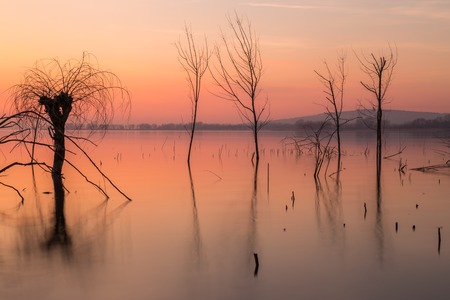 Beautiful sunset at Trasimeno lake (Umbria), with perfectly still water, skeletal trees and beautiful warm colors