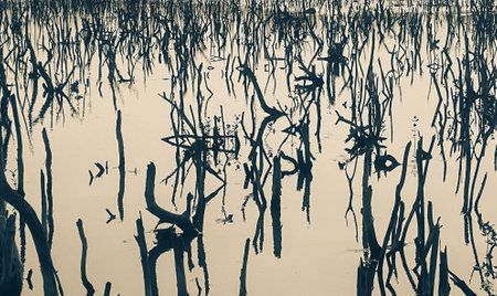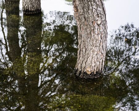 Textured tree trunks that grow out of the water and are reflected in it. The photo was taken using a long shutter speed. Natural background.