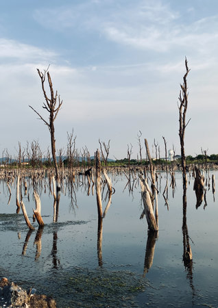 Dead trees in the water. The concept of environmental pollution and environment