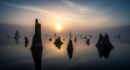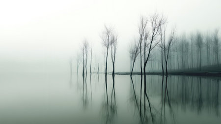 A serene misty landscape featuring bare trees rising from calm water, creating an eerie yet beautiful atmosphere, perfect for nature enthusiasts and artists.