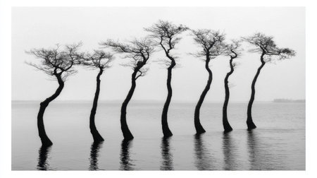 A group of slender trees elegantly rises from calm waters, creating stunning silhouettes against a soft foggy backdrop. The monochrome scheme enhances the serene beauty.