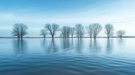 A peaceful image of bare trees standing in calm water, showcasing reflections under a soft blue sky. The scene evokes tranquility and natural beauty.