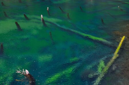 Fantastic panorama of emerald alpine lake with wooden logs