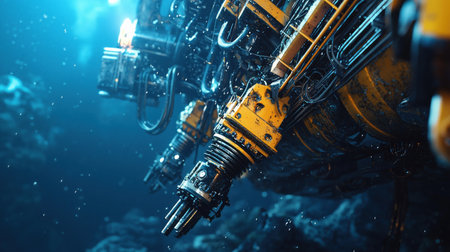 A close-up shot of underwater robotic machinery, showcasing intricate details and a vibrant blue environment.