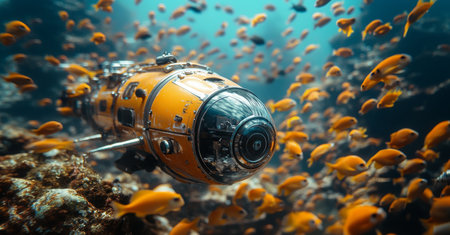 submersible, hovering above majestic seafloor, with schools of fish swimming in the background, created with generative ai